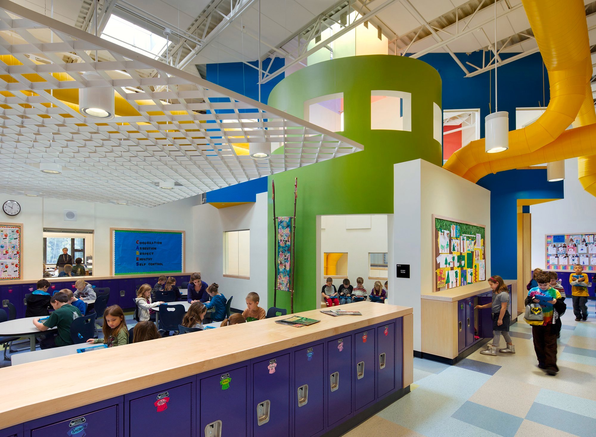In 2012, HMFH Architects unveiled three new elementary schools in Concord, New Hampshire, focused on providing adaptive, accessible, collaborative spaces. Featuring bold colors and ample natural light, the design includes a two-story learning corridor that houses an amphitheater, as well as spaces for art projects, group discussions, story-telling and individual reading. Where physical boundaries were necessary, glazing was utilized as much as possible to maintain a sense of openness and community.