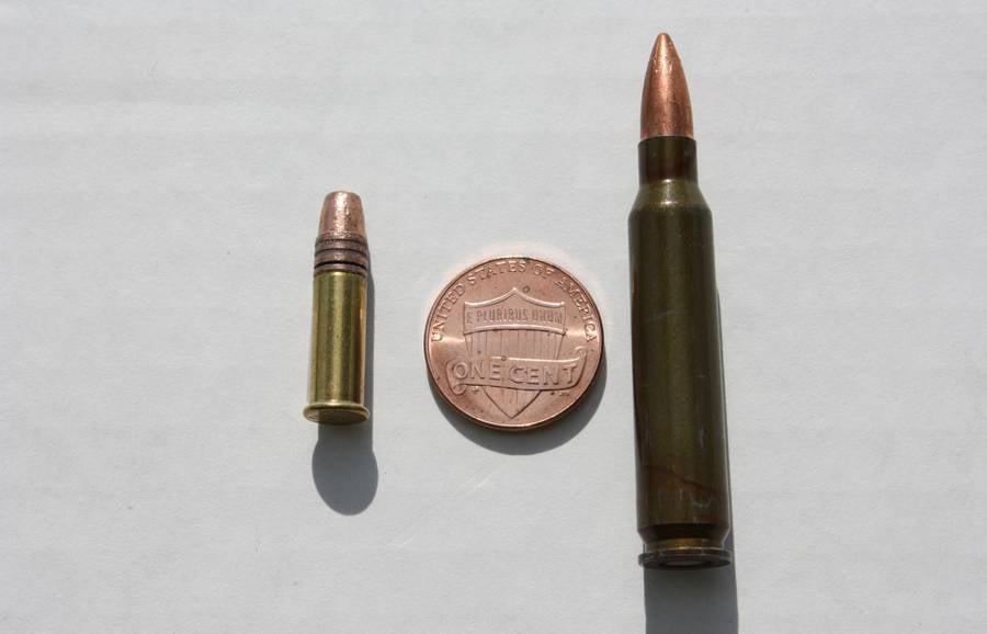 The .223 is the consumer version of the military’s 5.56 ammunition used in M16 assault rifles (which are in turn based on the Colt AR-15 semi-automatic rifle, and have become the model for modern sporting rifles). The projectile of the .223 has dimensions similar to that of the common .22 rifle cartridge (which are often used for teaching, target practice, “plinking,” and hunting very small game like squirrels, rabbits, and pest rodents). Both are shown in the image below (with the a .22LR on the left and the .223 on the right).