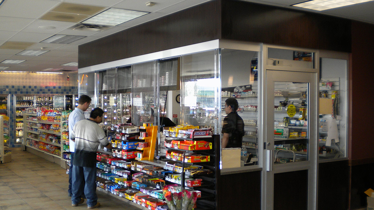 Custom bullet-resistant barrier that maximizes sight-lines and “natural surveillance” in convenience retail
