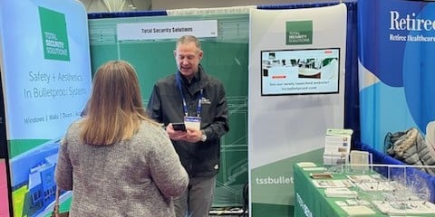 Visitors left the TSS booth with a variety of free resources, a Capabilities Flyer, a Municipal Building Security Checklist, and information on TSS’s new AIA-approved CE course “8 Levels of Bullet Resistant Material Explained.” In the background, a TV ran footage from a live fire product demonstration, similar to this webinar for corporate settings.