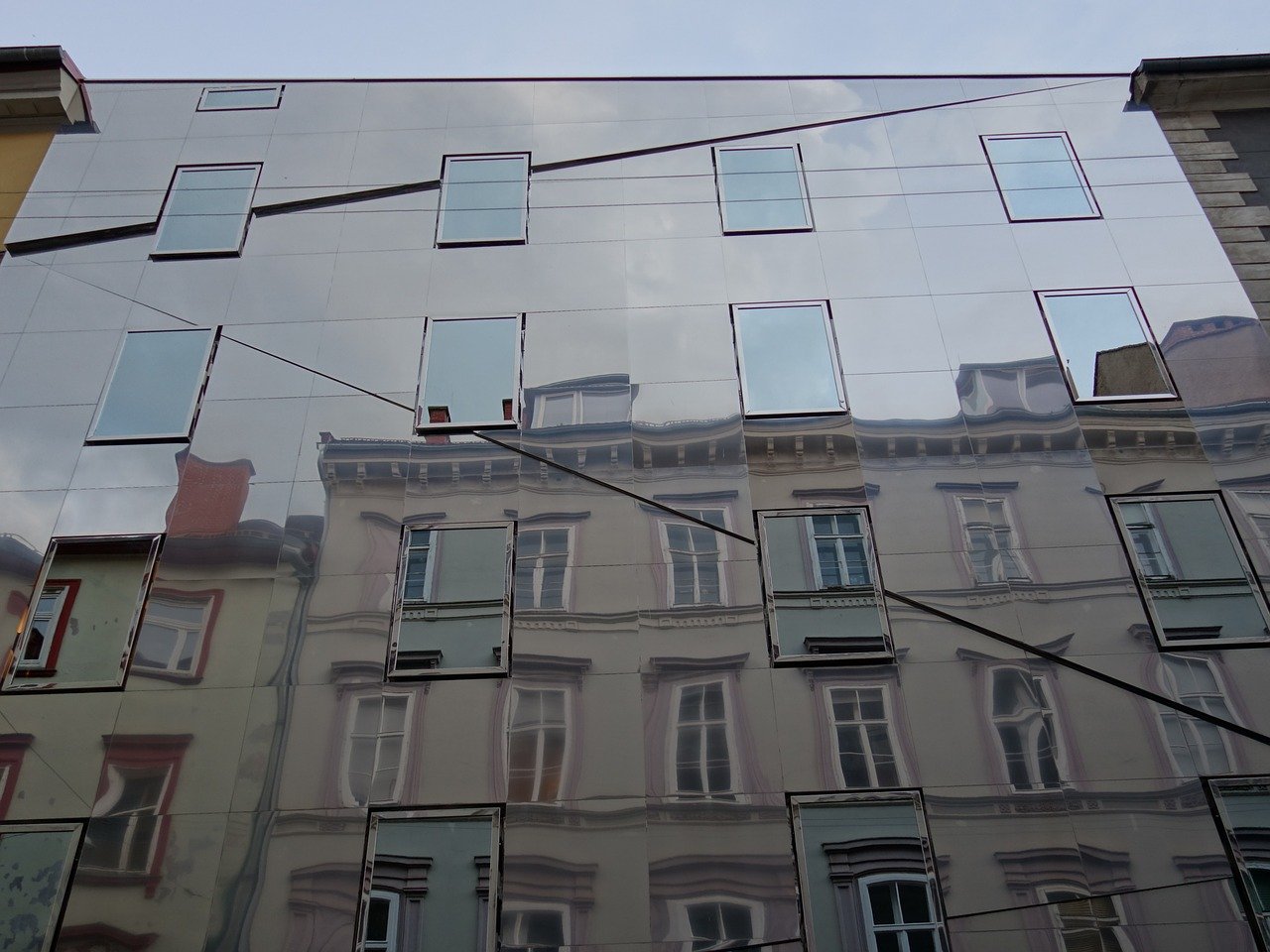 In 2013, Austrian-based Hope of Glory was met with the challenge of designing a residential building that seamlessly integrated into the surrounding historic architecture, as well as adhered to the strict historic preservation guidelines. They responded with a simple high-polished stainless steel exterior with an asymmetrical front sloped roofline to align with each side’s adjoining structure. The new building appears to be perfectly slotted into the available space and the mirrored exterior reflects the traditional architecture nearby, softening the appearance of its own sleek façade.